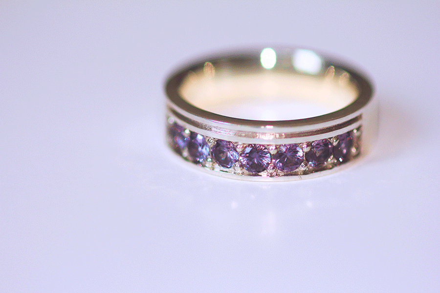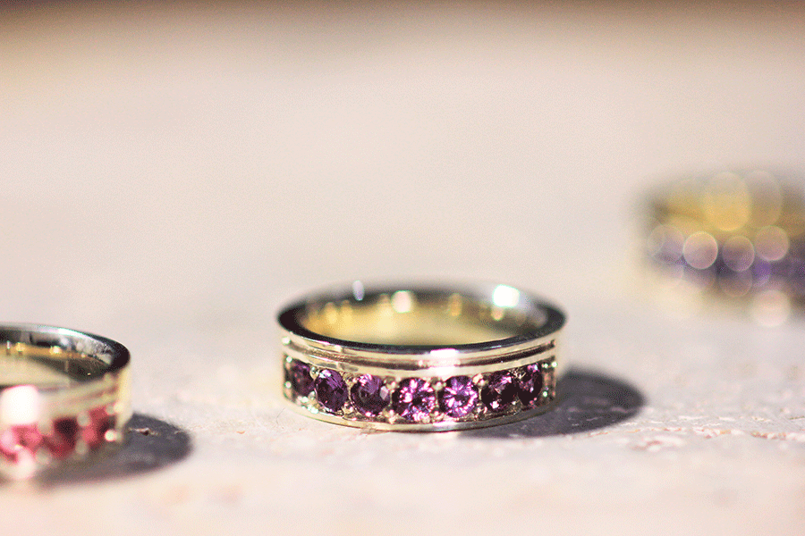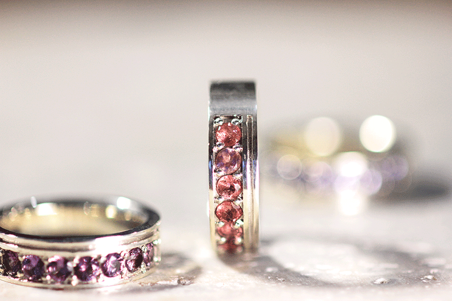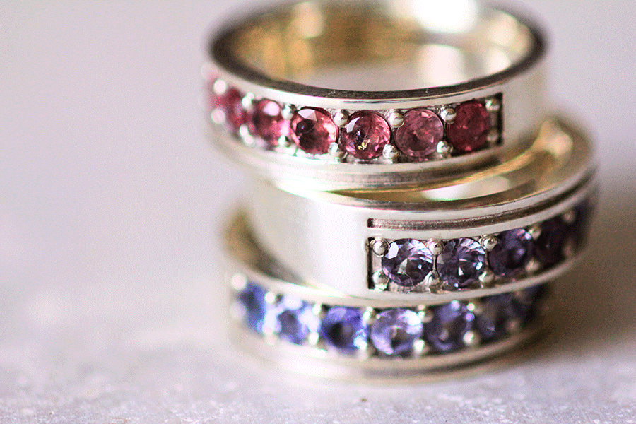 天然石の個体別の色味の違いを生かすべく、色ごとに繊細な濃淡をもつ紫陽花のイメージ。1本のリングの中で同系色の天然石をグラデーションに配置しました。